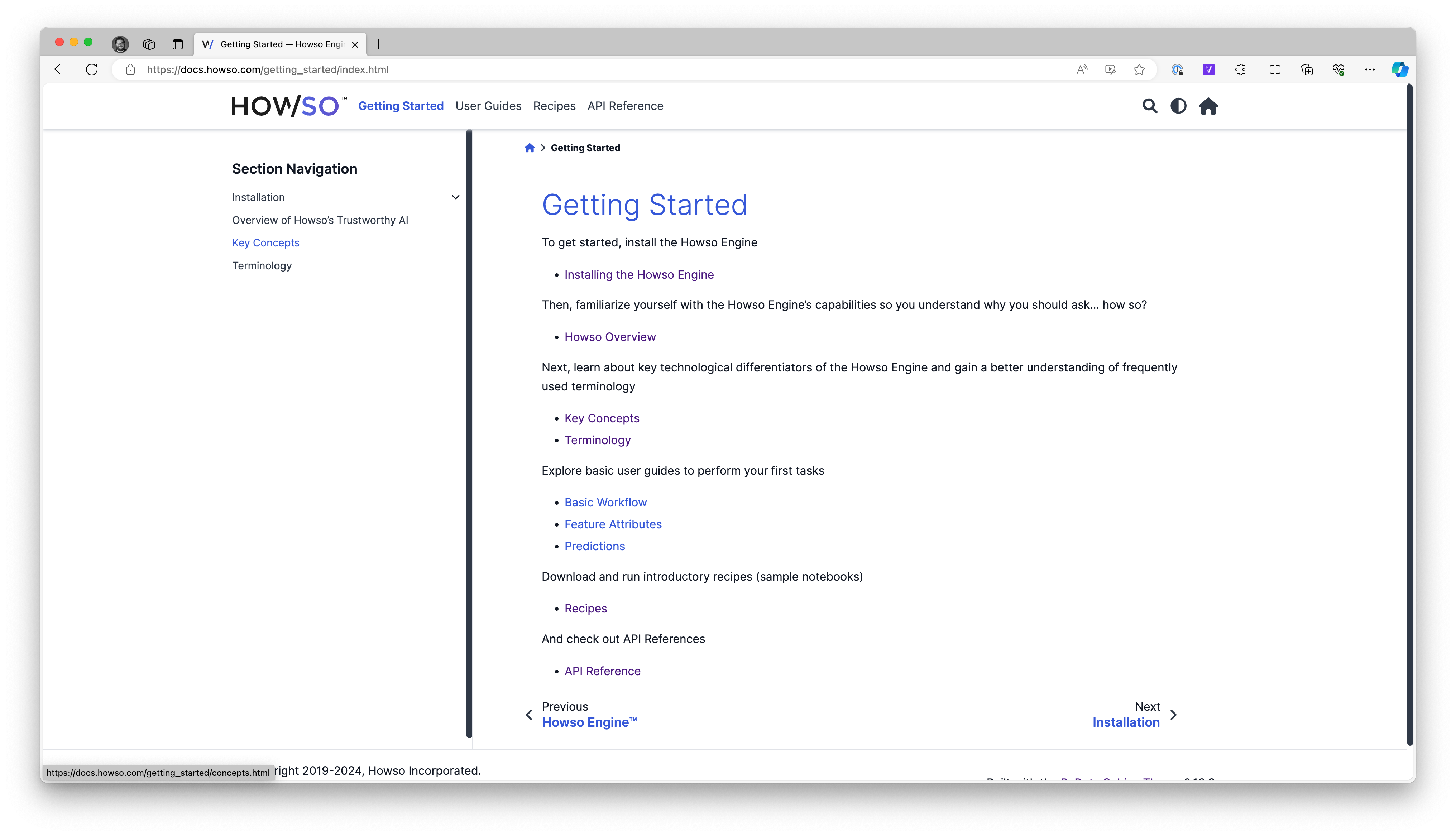 Our documentation contains a couple of guides: Getting Started & User Guides. The Getting Started guide cover the basics of installation, key concepts, and terminology. The User Guides focus on explaining capabilities and core concepts vital to working with Howso’s technologies.