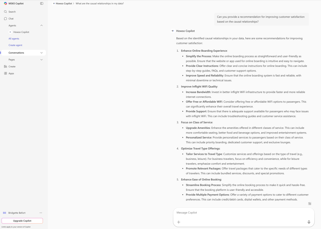 From there, business users can turn to Copilot to chat with their data to identify next steps. By asking Copilot in natural language, “Can you provide a recommendation for improving customer satisfaction?” they receive trustworthy, data-grounded recommendations, based on deep analytics generated by Howso. For instance, Copilot may suggest that upgrading the quality and reliability of in-flight Wi-Fi would significantly boost satisfaction, while also highlighting improvements to the boarding process and online booking experience as additional opportunities to enhance the customer journey.