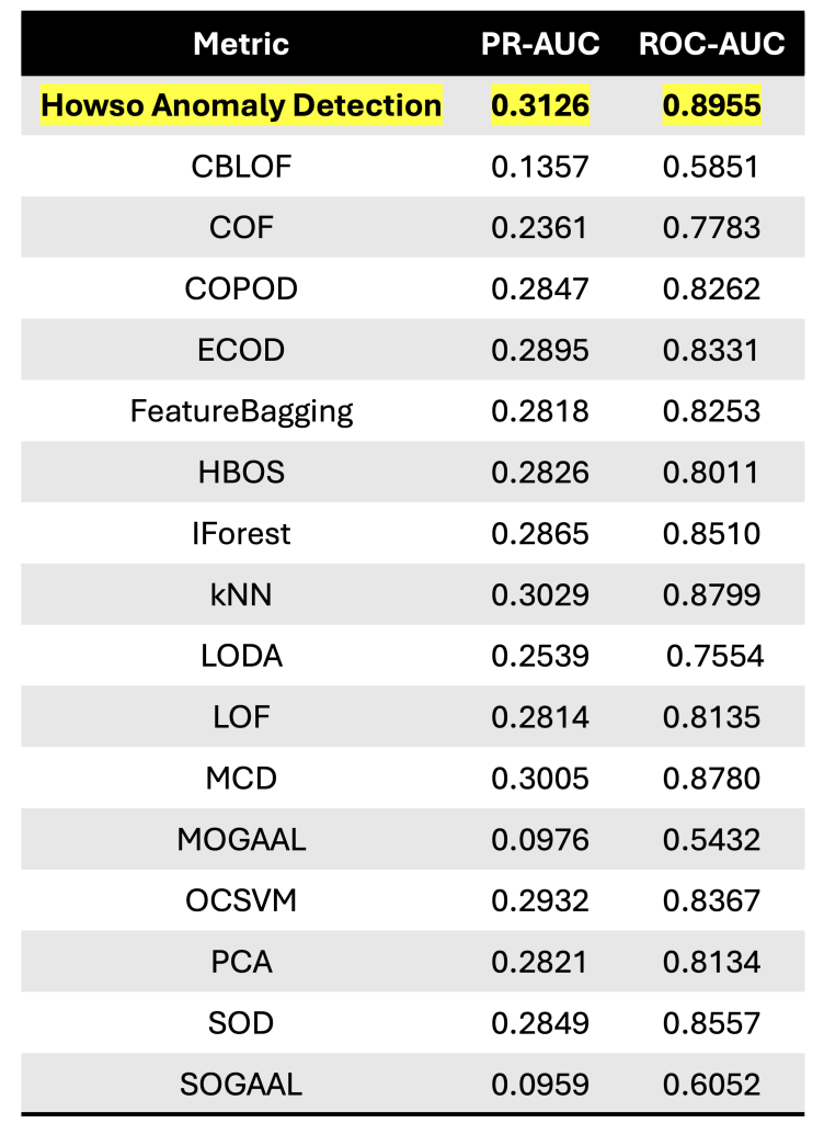 Howso continues to push the boundaries of trustworthy, interpretable AI. Explore our full benchmark results (+more!) [https://arxiv.org/abs/2510.22809], or contact us for a demo to see how Howso can help your organization detect, classify, and understand anomalies in real-world data.